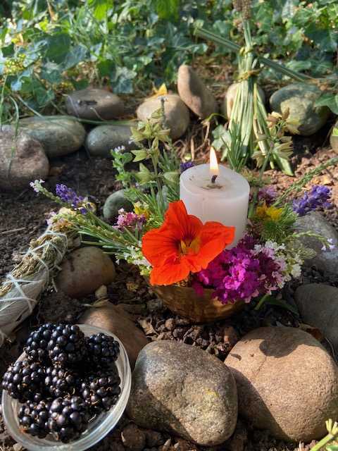 This Lughnasadh I made some offerings to my little plot of land, grateful for the herbs and sanctuary it has provided me over the past year. I don’t grow any grain so I couldn’t make a traditional corn dolly, but I did make an improvised ‘Plantain dolly’ as a nod to that tradition! I collected some black berries, some grasses and herbs, burnt some dried herbal incense and lit a candle.