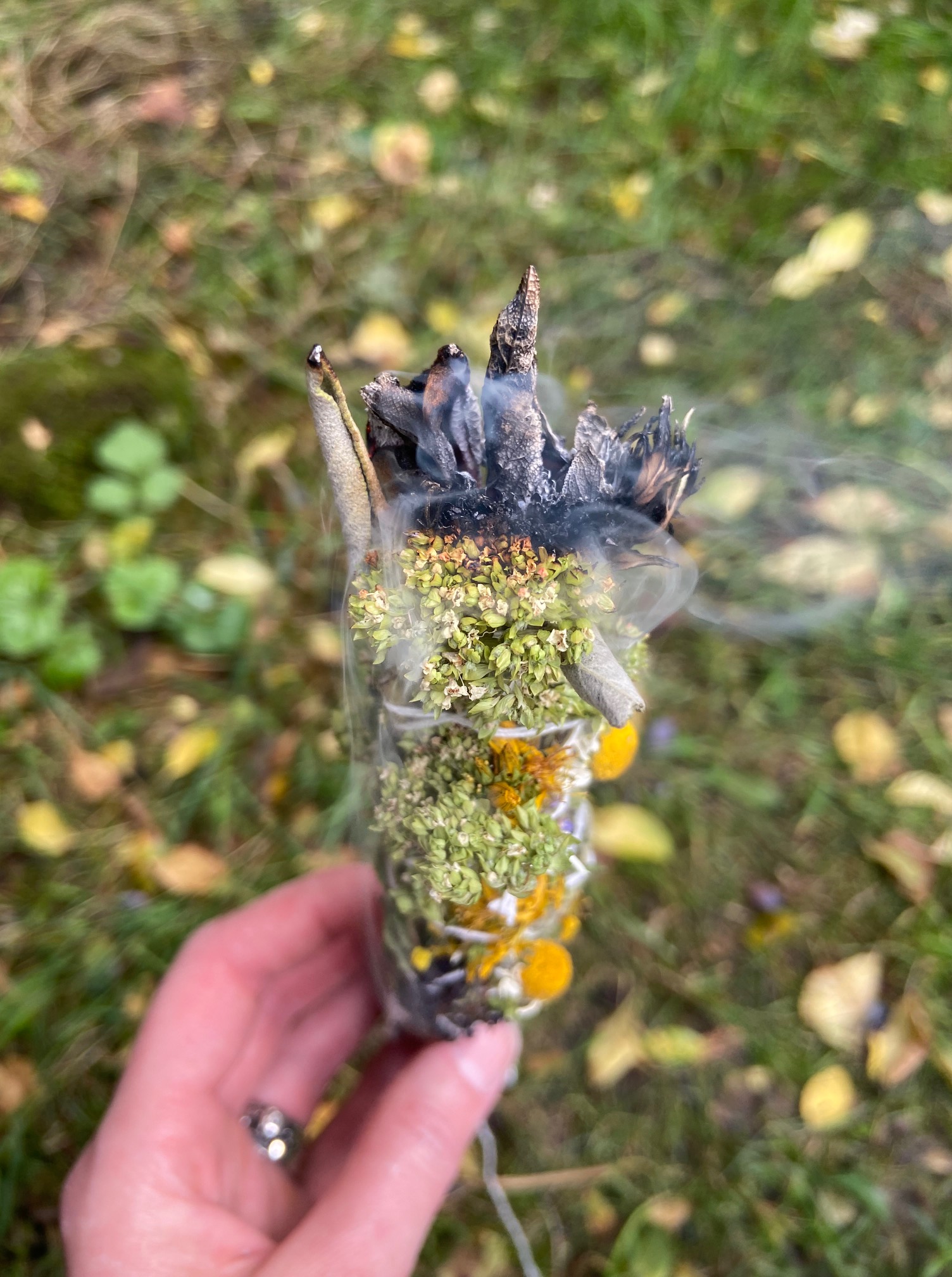 I love making natural herbal incense in the form of herbal smoke bundles for space cleansing and working with my clients. I grow the herbs myself and harvest them with respect, leaving offerings in exchange. I grow the herbs myself or forage them from the local area and choose herbs that are connected to cleansing, protecting and healing as well as herbs that smell amazing!