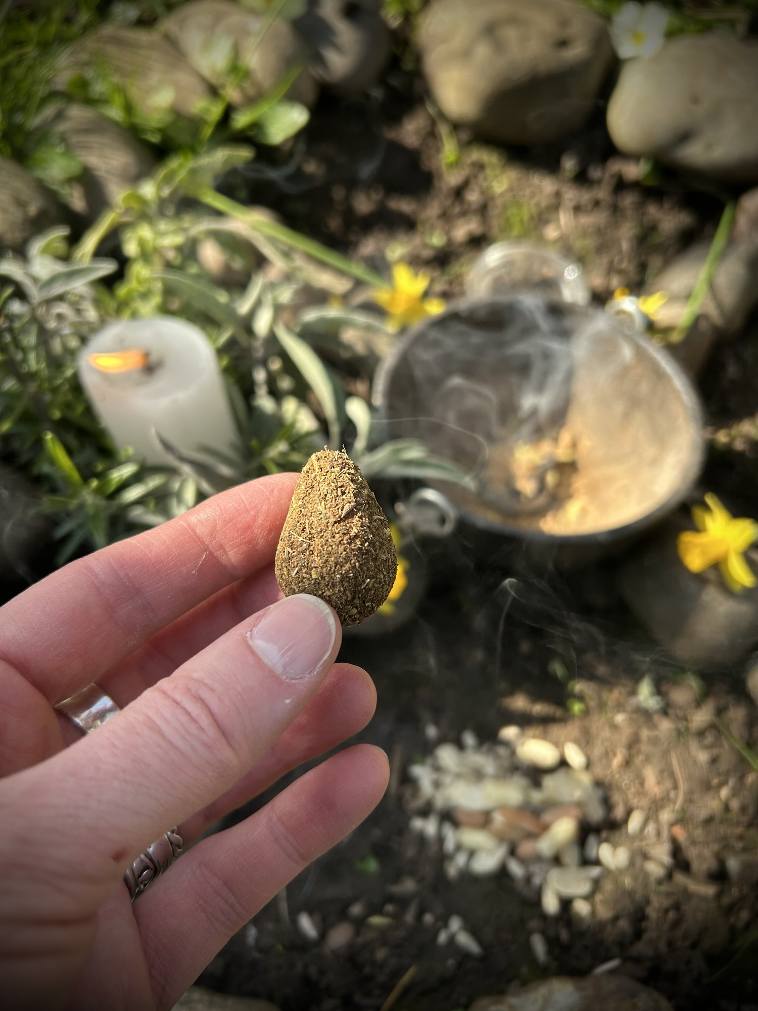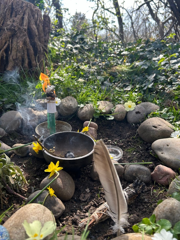 I gathered with a friend in my little sacred outdoor space, and brought a green candle, paper, string and incense offering. We created an altar space on the ground and made offerings in connection and gratitude to the place and the elements with flowers, herbs, seeds, water and offered the incense, which included a special Ostara ‘incense egg’ I had made.