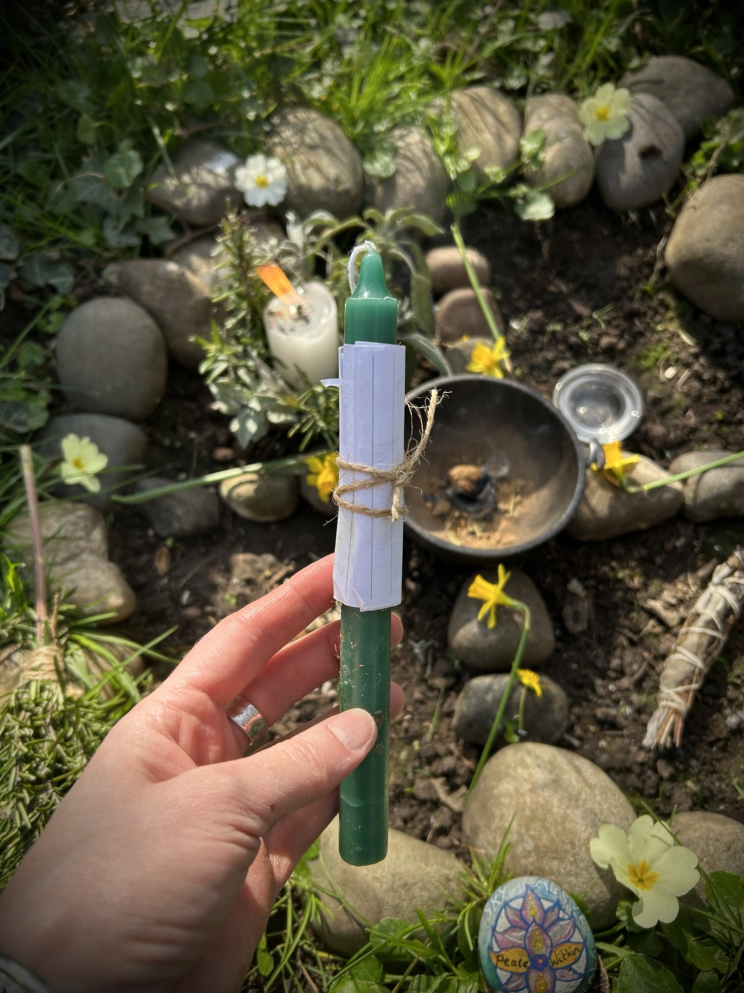 We each wrote our affirmations down on small pieces of paper, folded them and tied them to the candle. We also anointed the candle with oil containing herbs that are connected to cleansing, protection and abundance, both to help the candle burn and support our intentions. (Always practice fire safety when burning this type of candle as the flame is big and wild!) The green candle is related to the colour of the ‘greening’ of spring and the colour for abundance – using the colour and time of year to align with bringing our intentions to fruition and attracting the necessary conditions to achieve our intentions.