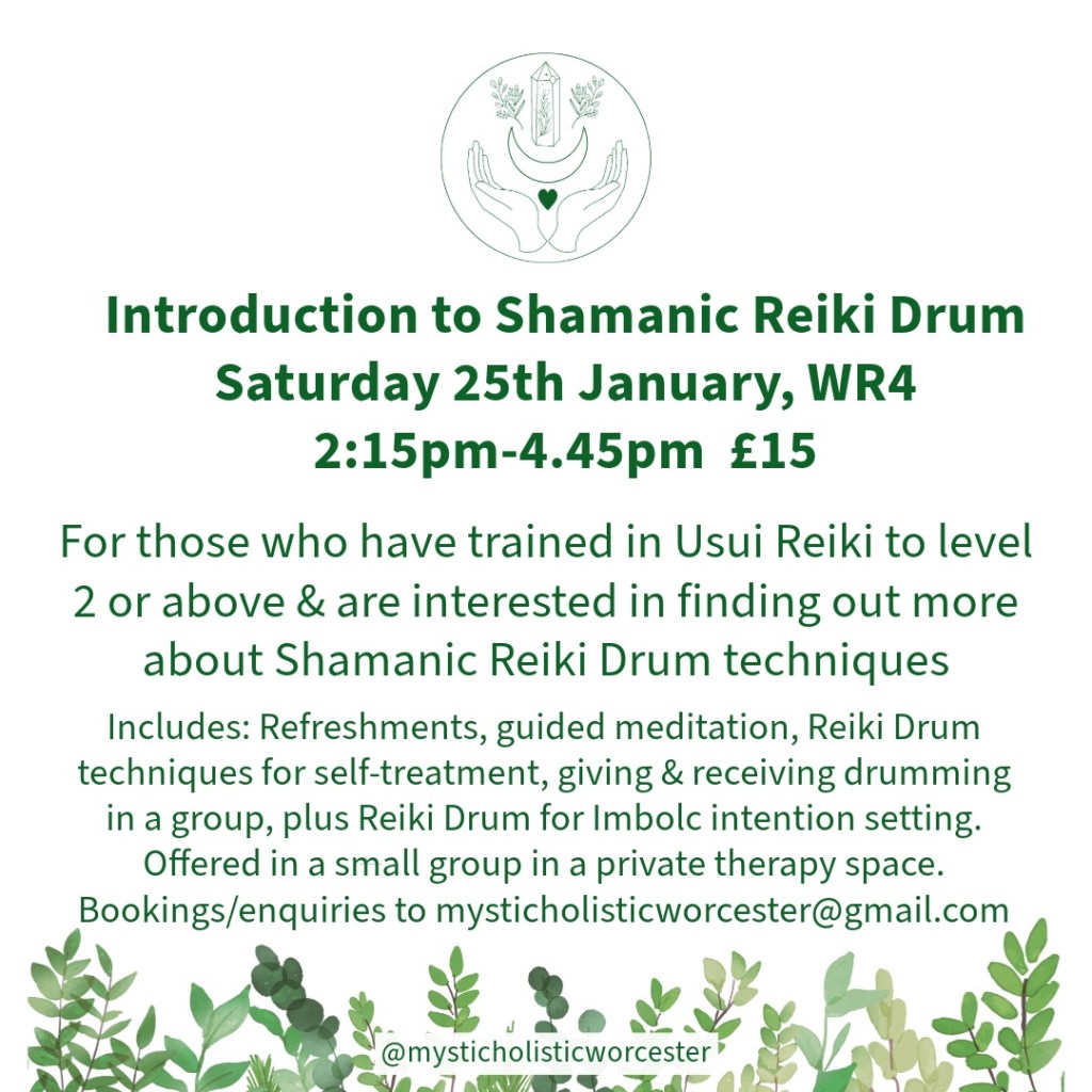 This will be a relaxing afternoon offered to a small group, for those interested in learning more about techniques and benefits of Reiki Drum, giving and receiving Reiki Drum, and for tuning into the energy of Imbolc and renewal. It’s also for those interested in my forthcoming Reiki Drum Practitioner training, which I’ll be offering in Worcester soon.